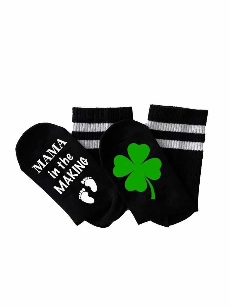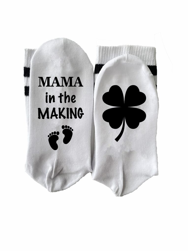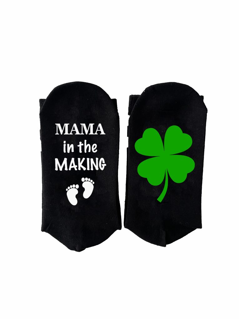 — Design: text „Mama in the Making” + piciorușe bebeluș / trifoi verde